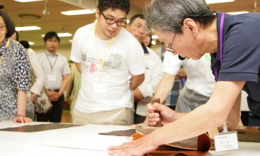 日本特有の仕上げ方法「バタ振り」の実演とブックカバーのカラーリング体験。