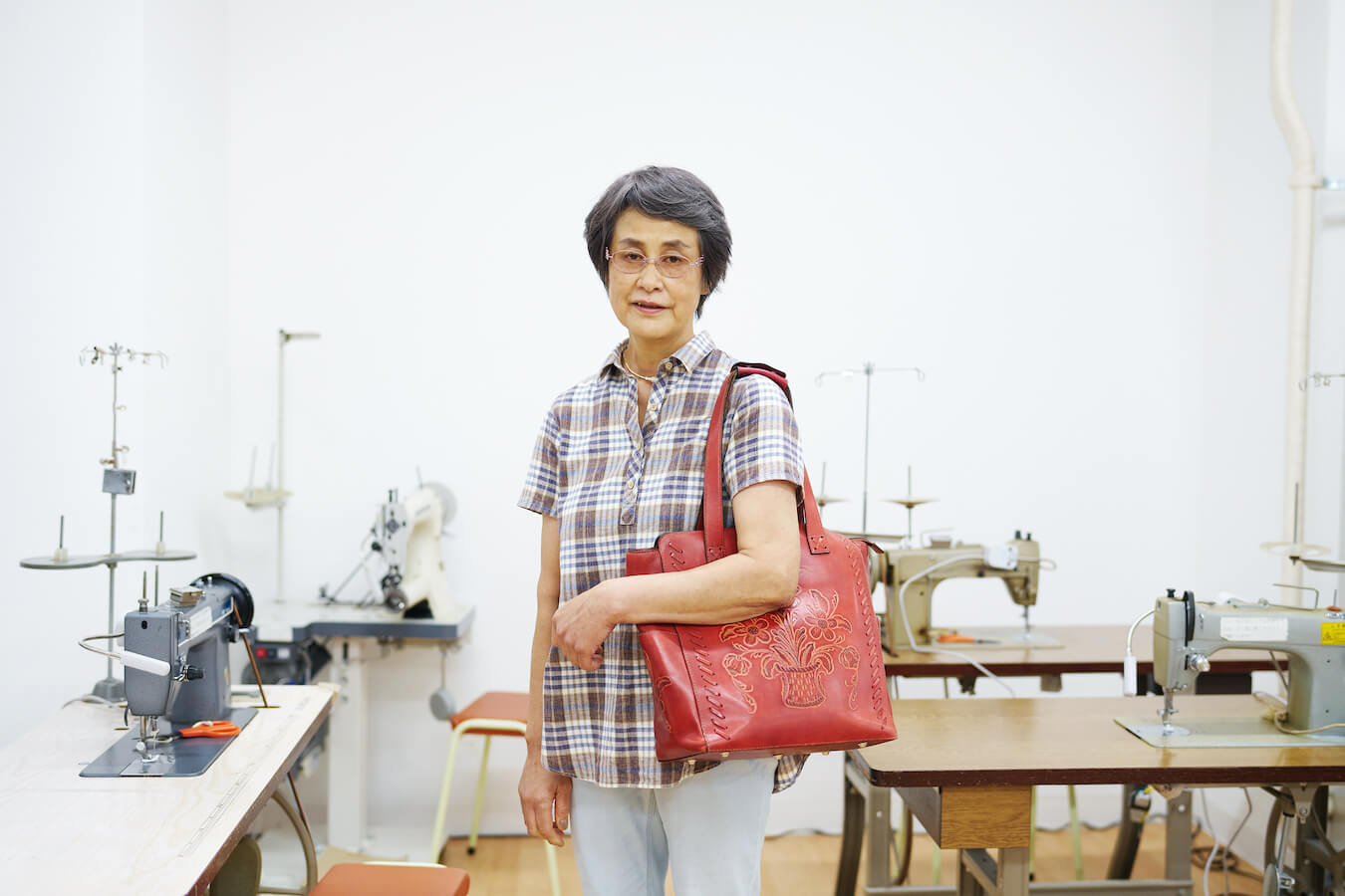 鮮やかな赤がきらびやかに映えるカバンを手に。下井先生自らが手がけた作品です。