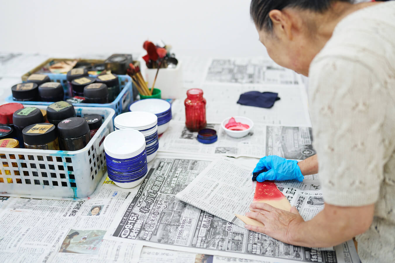 染色の工程もすこしだけ体験させてもらいました。手際の良さがとても印象的です。