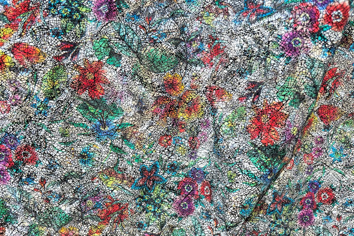 | コメント | 発光したようなパール素材とマットなフロックで表現する、 今季のトレンドテーマに沿ったイチオシテキスタイル。 透け感を残したチュール合わせがオススメです。 |