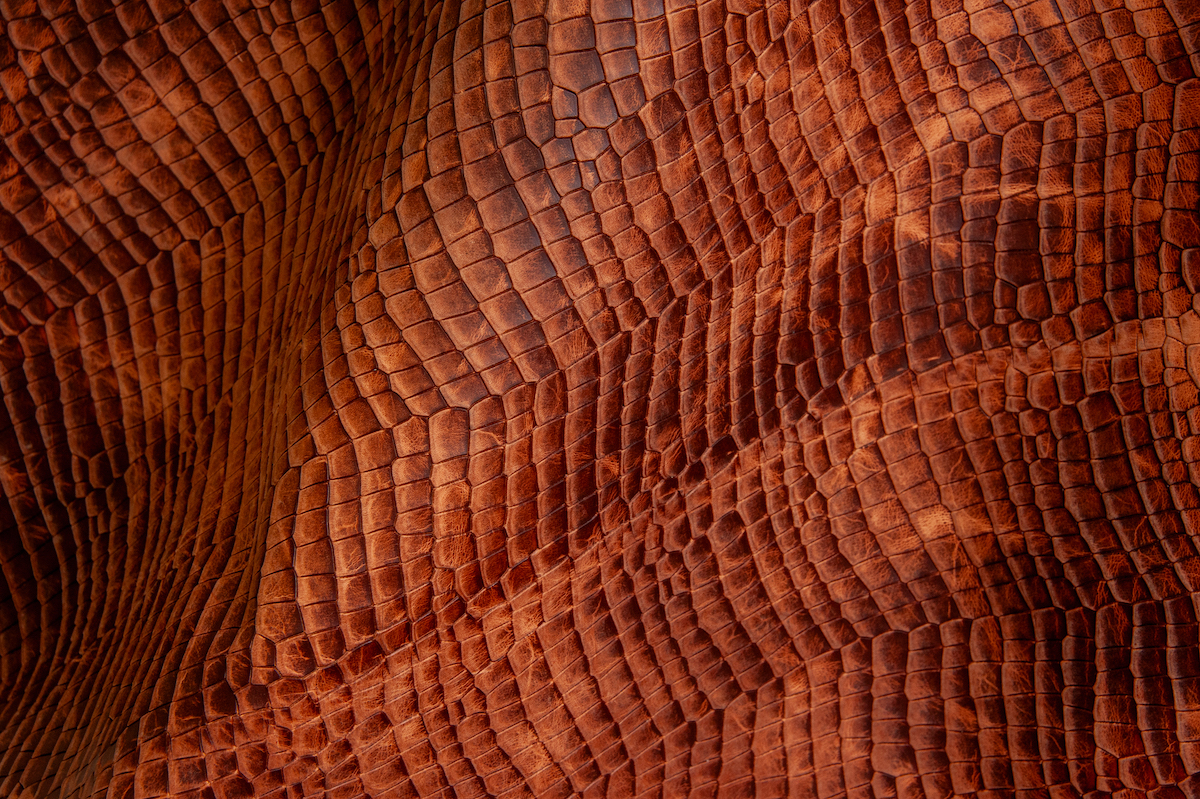 | コメント | オリジナルレザー「モストロ」が、クロコ型押しプルアップレザーに化けました。約10kgのハンドアイロンと手塗りの工程でワックスを含浸させ、各クロコの斑が独立した状態に仕上げています。職人の手による丁寧な作業で、量産では表現できない珠玉のレザーが完成しました。 |