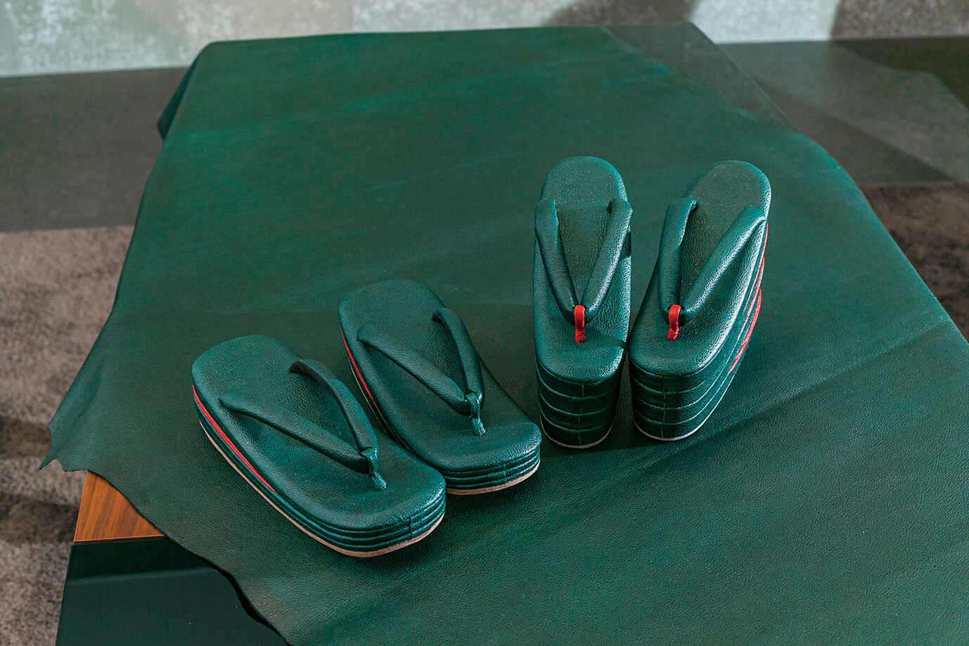 鞣しは環境に配慮した日本のエコレザー認証を受けた革に、自然を連想させるグリーンで