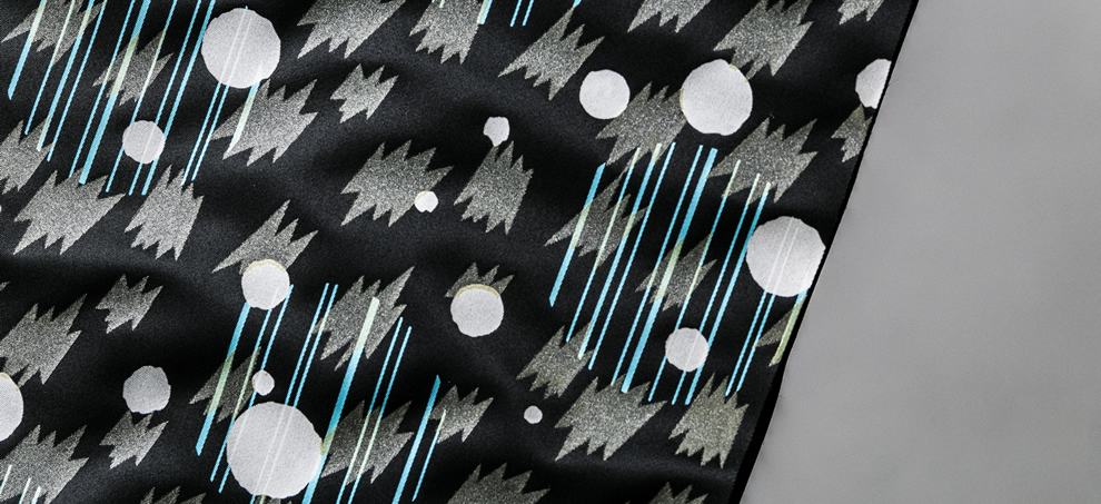 | コメント | 弊社在庫品「センス」に、雨模様の柄をプリント。ストライプの雨と雲は顔料、イナズマは光を反射するリフレクトプリントで表現。暗い雨の日でも、チラチラとハッピーな気持ちになれる機能素材です。 |
