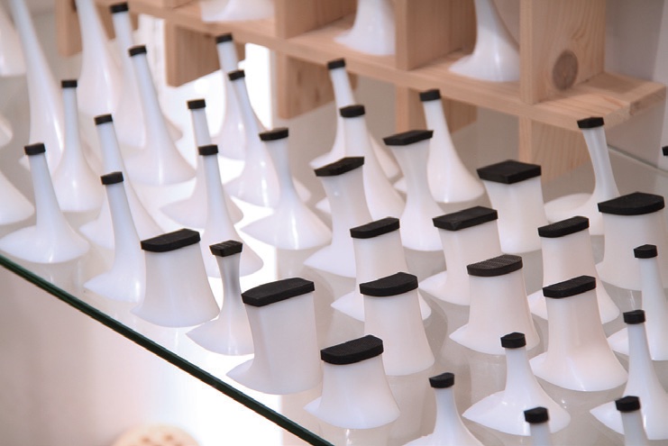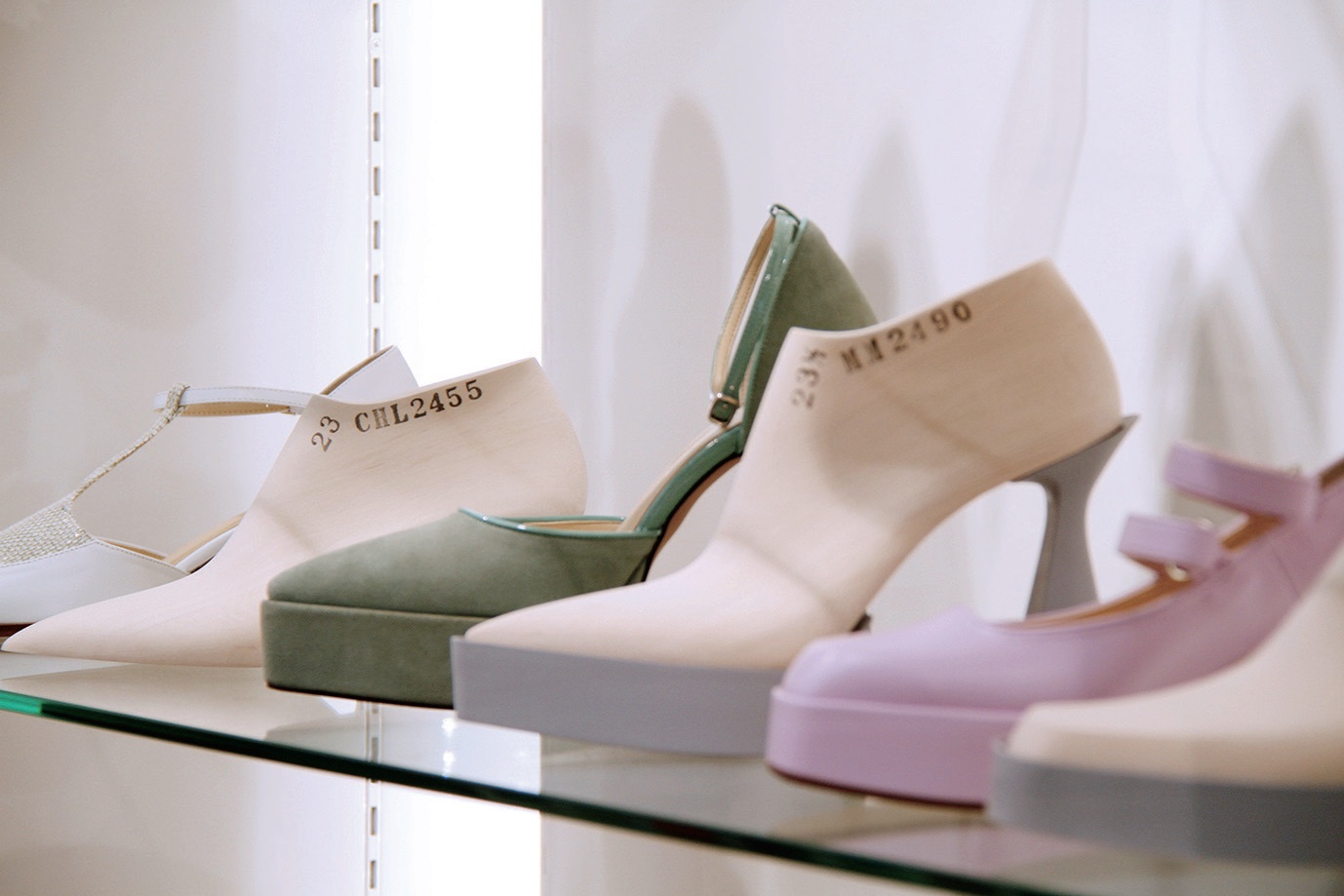 最近ではUVプリンターやレーザー加工機・3Dプリンターを駆使して、少ない単位でのオリジナル表現も可能になりました。昨今のテクノロジーは本当に素晴らしく、弊社にとっても大きな業務拡大に繋がりました。例えば、今までヒール1個作るにしても職人さんが手で削り、次に金型起こし、プラスチック成形を経てやっと靴に使えるようになるので時間と費用が莫大でした。3Dプリンターの良いところは、そのままプラスチック成形ができるため、修正も容易に行うことができ、短納期で製靴に使えるサンプルを作ることができます。靴になったサンプルを展示し、好評だったモデルの金型で生産という流れになり時間とリスクを大幅に軽減できます。撮影用の靴などは、それこそ3Dプリンターでまかなえます。