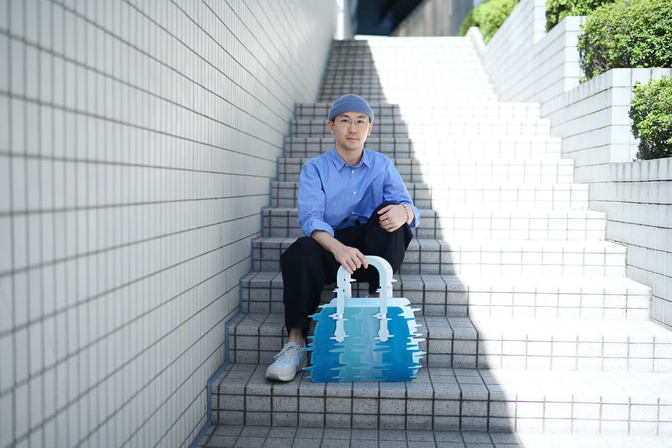 深津さんの作品はポップなカラーのハンドバッグ。目の錯覚が起きそうな奇抜なデザインです。