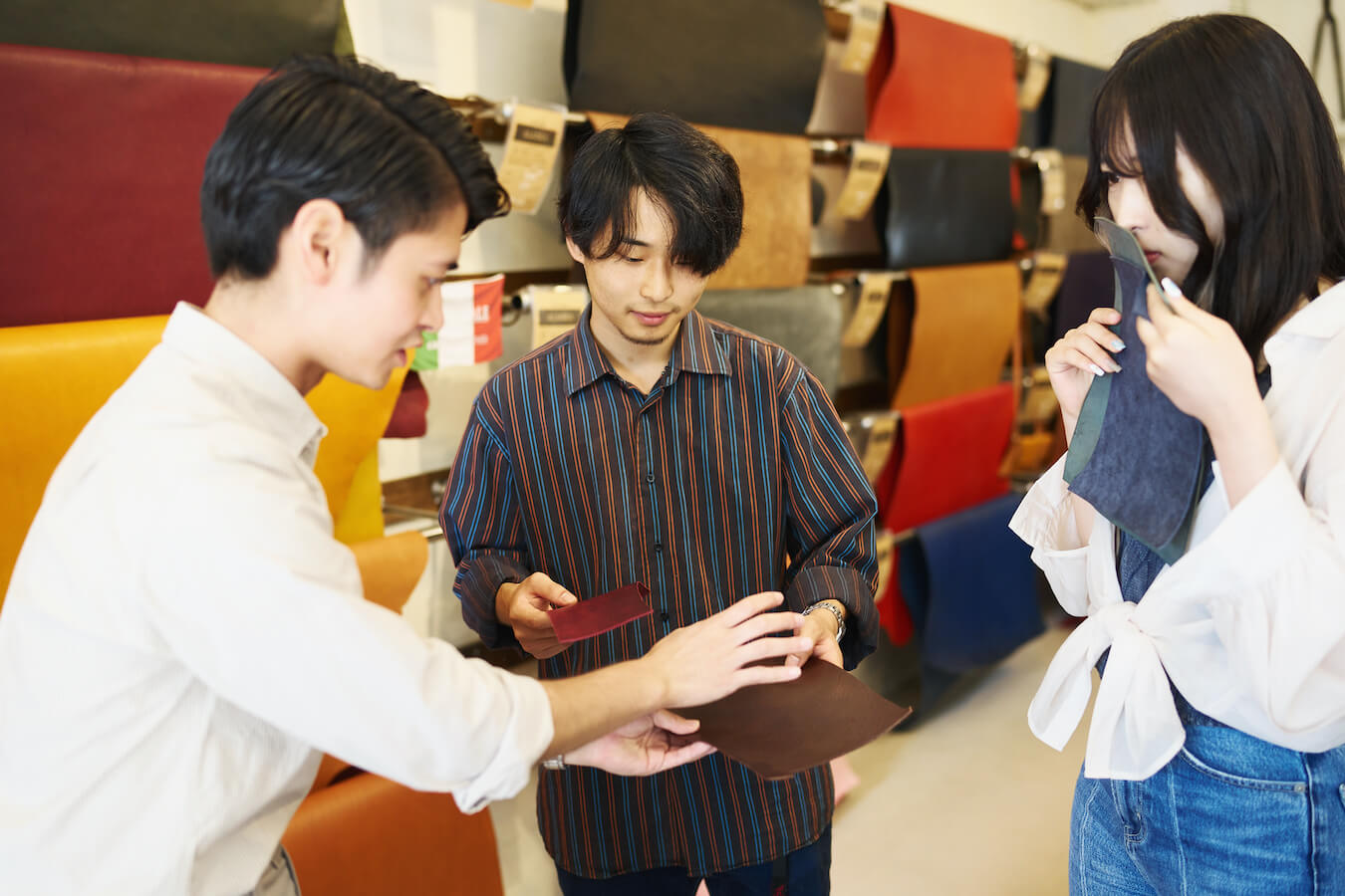 それからわずか3日後、今度は学生のふたりが川村通商株式会社が運営する革の小売店『KAWAMURA LEATHER』を訪問します。同社が展開するさまざまな事業に関わる説明を聞いた後、数多くの革に触れ、さらに橋本さんのご好意により、簡単な革小物の製作を体験するという、ふたりにとって濃密な1日となりました。