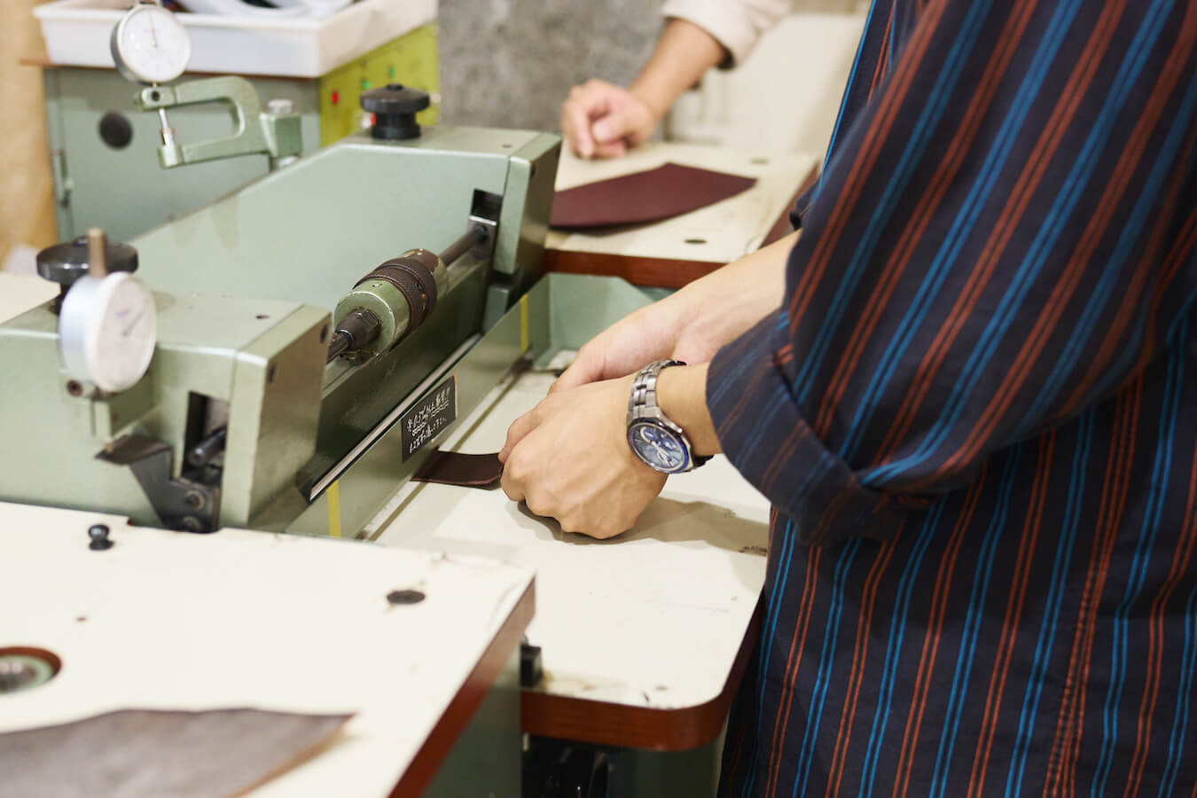 型抜の次は、革の厚みを均一に削っていく工程です。使用するのは『バンドマシン』という機械。ロール型の刃が内蔵されており、厚みのある革の裏側を漉いていきます。天然の革は、厚みや柔らかさに個体差があるもの。それを一気に薄くするのではなく、厚みを確かめながら少しずつ調整して、理想の厚みにしていきます。