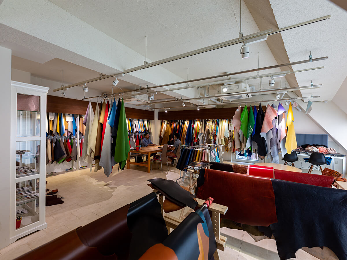 同社において、半年ごとに発表される膨大な数の新作。それらはすべて、スタッフ一人ひとりが、革の可能性を模索する中でうみ出されたものになります。また、提案者となるからには、自身も革好きであるべきだという風土が根付いており、社内には革に関する無数の資料が用意されています。革をとことん愛する者が、つくる革。それは、自然がもたらした最高の繊維である皮革の魅力を余すことなく表現したものに他なりません。顧客からのオーダーだけにとどまらない、自社の開発競争こそが、幅広い提案力の源泉となっているのです。