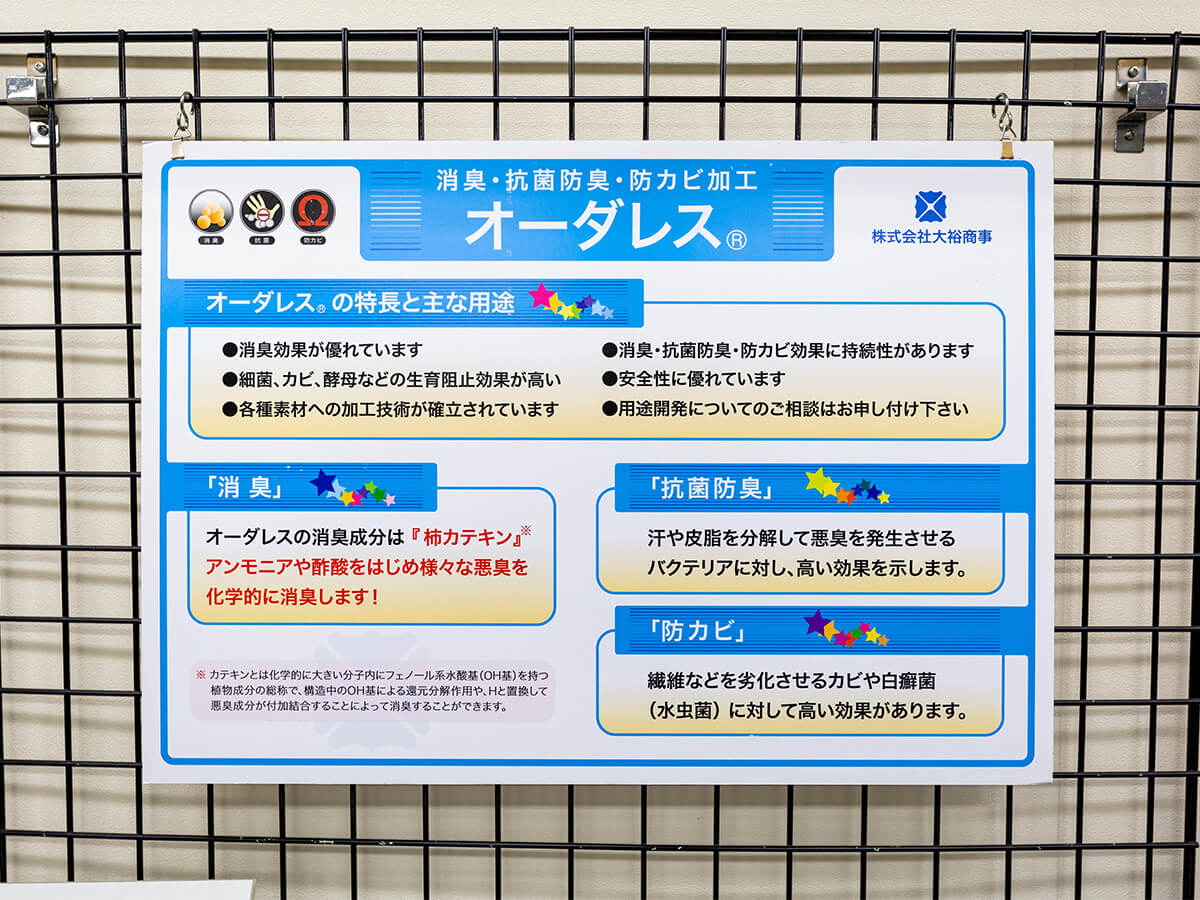 商品の企画から、研究・開発、デザインに販売まで、一貫して手がける同社。特徴的なのは、検査機関までを自社に完備している点です。その内容も、物性の測定から、抗菌・抗カビ、さらに消臭試験までを網羅。これらの検査機能を充実させることで、より本質的なニーズに応える素材の提供が可能になっています。また、これまでさまざまな素材をうみ出してきた実績があるからこそ、それらを組み合わせることで、次なる新素材をつくり出すことも珍しくありません。今後もメーカー各社の願いを叶えるべく、惜しみない努力を続けていきます。