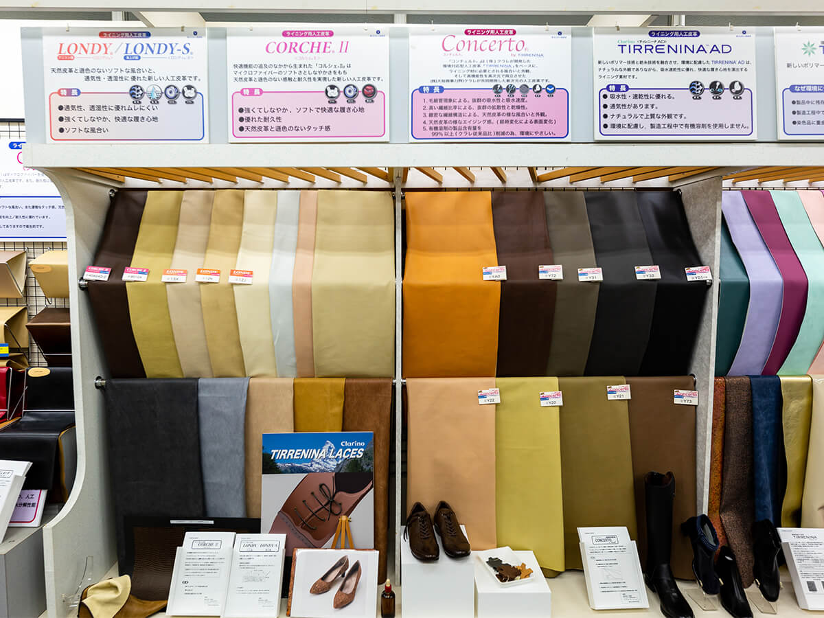 靴に関わる素材と副資材に特化して事業を行う(株)大裕商事。人工皮革に合成皮革、合成繊維、本底にインソール……と、国内トップクラスの幅広い製品ラインナップを誇ります。また、革靴に機能性素材を取り入れた先駆者でもある同社。創業から半世紀にも及ぶ期間を、素材の進化とともに歩んできました。靴に求められるものをリサーチしながら、自社で研究開発を行い、先進的な材料をうみ出す。その中で培われた経験や知見があるからこそ、多様化を極める市場のニーズにも応え続けられるのです。