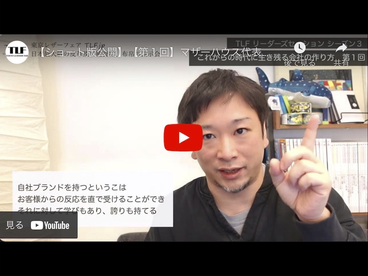 昨年10月から、オンラインと東京レザーフェア会場にて計4回にわたって開催された、『TLF主催 リーダーズセッション』マザーハウス代表・山崎大祐 氏と学ぶ「これからの時代に生き残る会社のつくり方」シーズン 3『チェンジ企業に学ぶ』のショート版が、YOUTUBEにて公開されています。