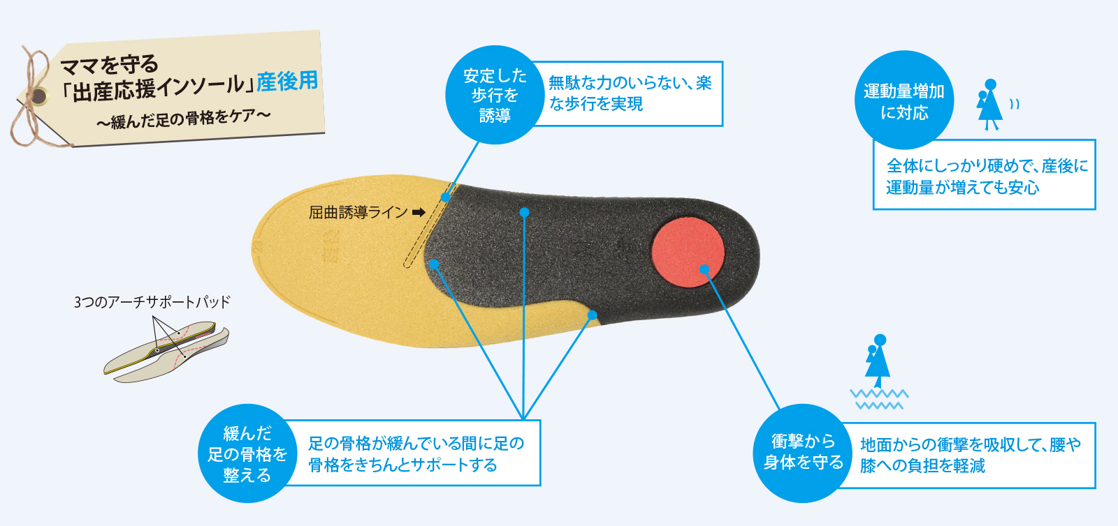 「出産応援インソール 産後・産後」は、「マイナートラブル」と捉えられがちなママの身体の悩みをケアすることは出来ないかという思いから生まれたインソールです。