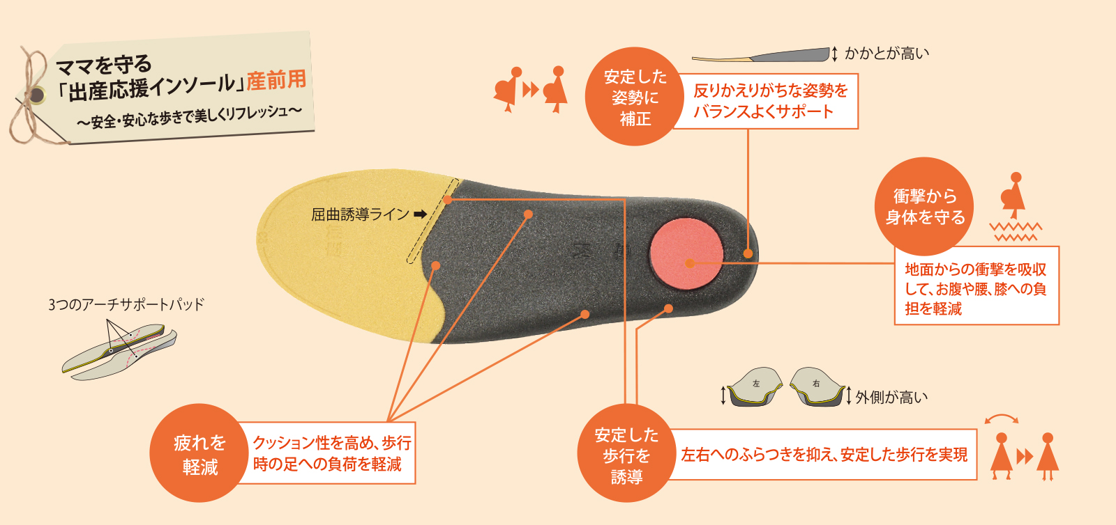 お腹の子どもの成長に伴う足腰への負担や姿勢の反り返り、歩行時の身体の左右へのふらつき、そして出産に向けて骨盤を開く女性ホルモンの分泌による足の骨格の緩みなど、これらに起因する「疲れる」「腰痛や膝痛がつらい」「歩行が不安定」といった身体の悩みを妊娠中に抱えています。